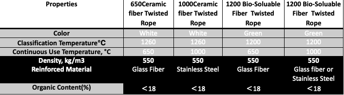 Ceramic Fiber & Bio-solutable Fiber Twisted Rope technical data sheet